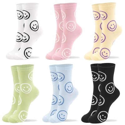 Women Cute Crew Socks | 4-6 Pairs Smiley Face Heart Character Design Novelty Bear Print Fun Graphic Cotton Socks